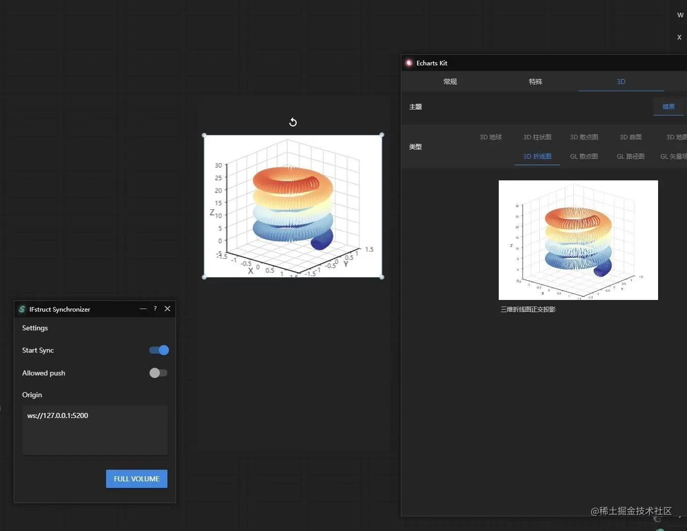 比如我们通过 Echart Kit 拓展,添加一个三维·折线图·正交投影的图表到可视化编辑区
