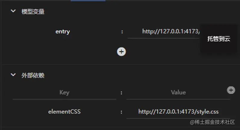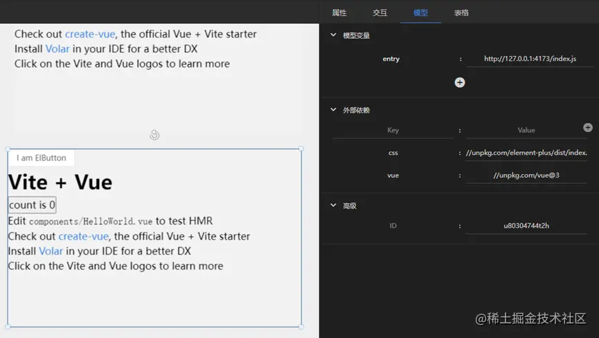 回到 iofod 编辑器,继续添加外部组件,添加 Vue 和 element UI公共样式为外部依赖(同样地,可以用打包出来的 style.css 代替公共样式,取决于实际场景需要),根据打包出来的文件结构设定 entry 模型变量,即可看到导入效果