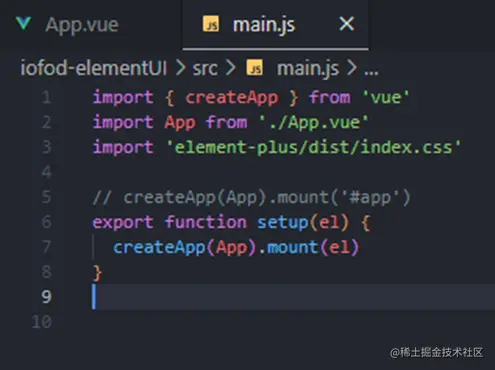 iofod 要求导入的外部组件必须是一个 ES 模块,模块暴露 setup 方法给 iofod 调用来初始化外部组件。我们根据要求,把直接挂载 Vue 实例的这一行代码改造成通过 setup 传入挂载节点的模式:
