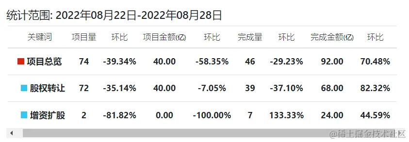 主要对项目总览、股权转让、增资扩股进行汇总,从项目量、项目金额、完成量、完成金额等维度出发,并做了环比计算。详情如下图: