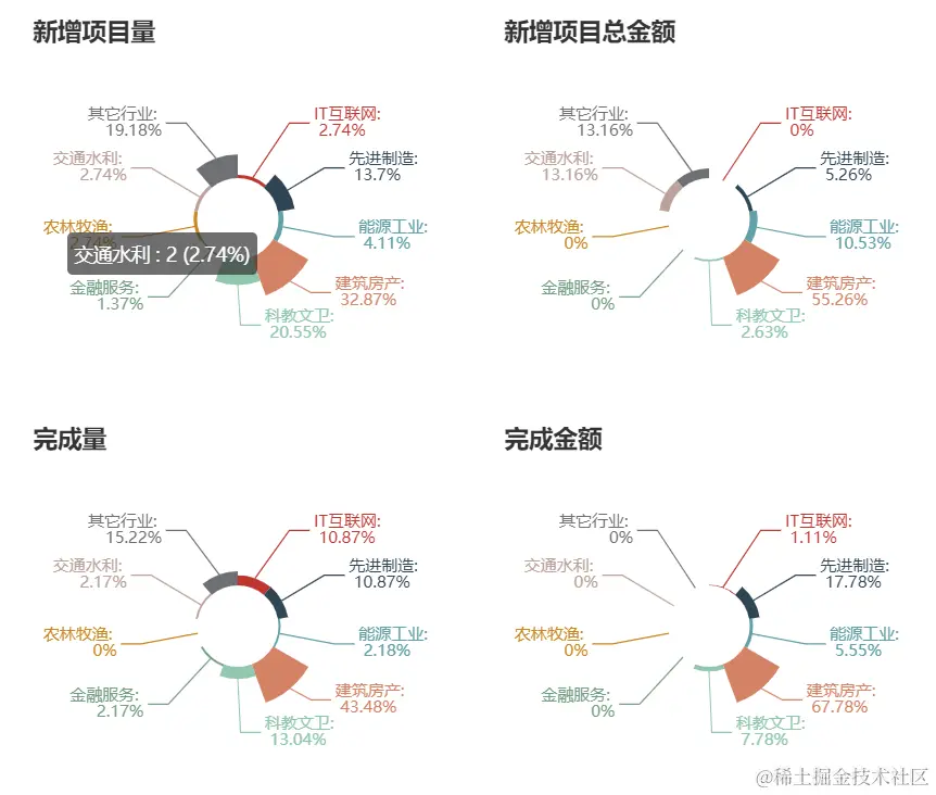 塔米周报按照行业对新增项目量、新增项目总金额、完成项目量、完成项目金额进行了统计并可视化展示。