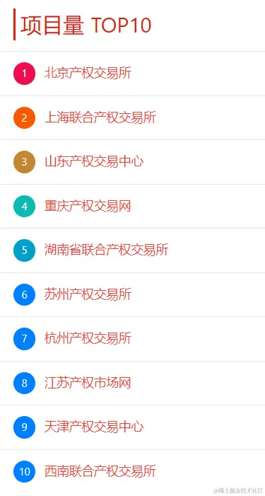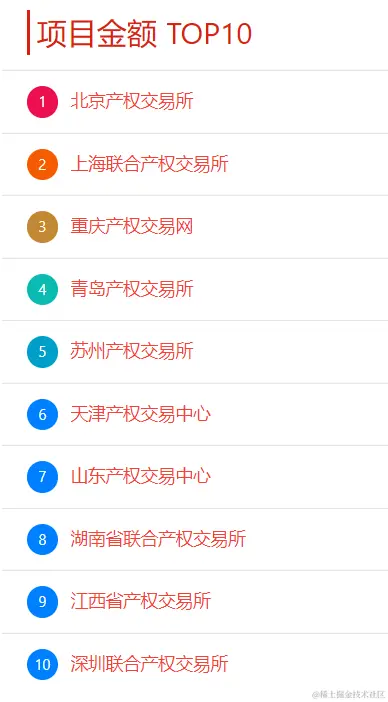 本周交易机构新增披露项目量排名TOP10有:北京产权交易所、上海联合产权交易所、山东产权交易中心、重庆产权交易网、湖南省联合产权交易所、苏州产权交易所、杭州产权交易所、江苏产权市场网、天津产权交易中心、西南联合产权交易所