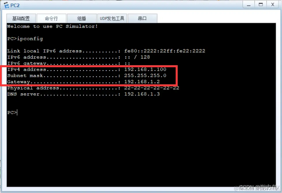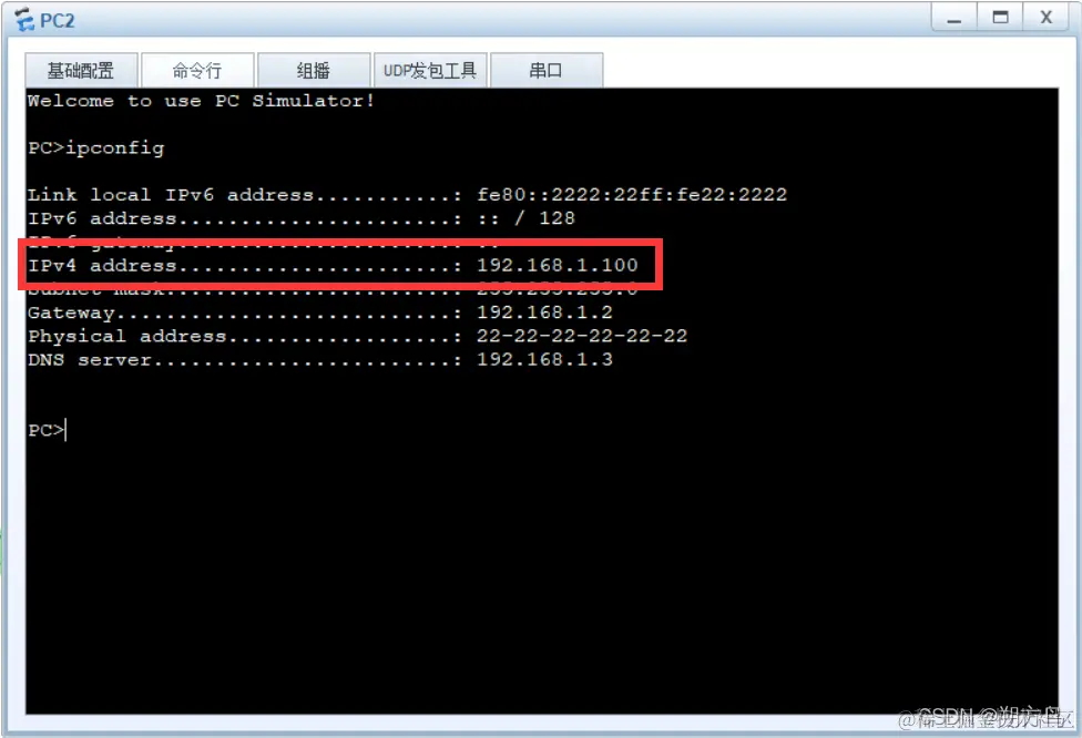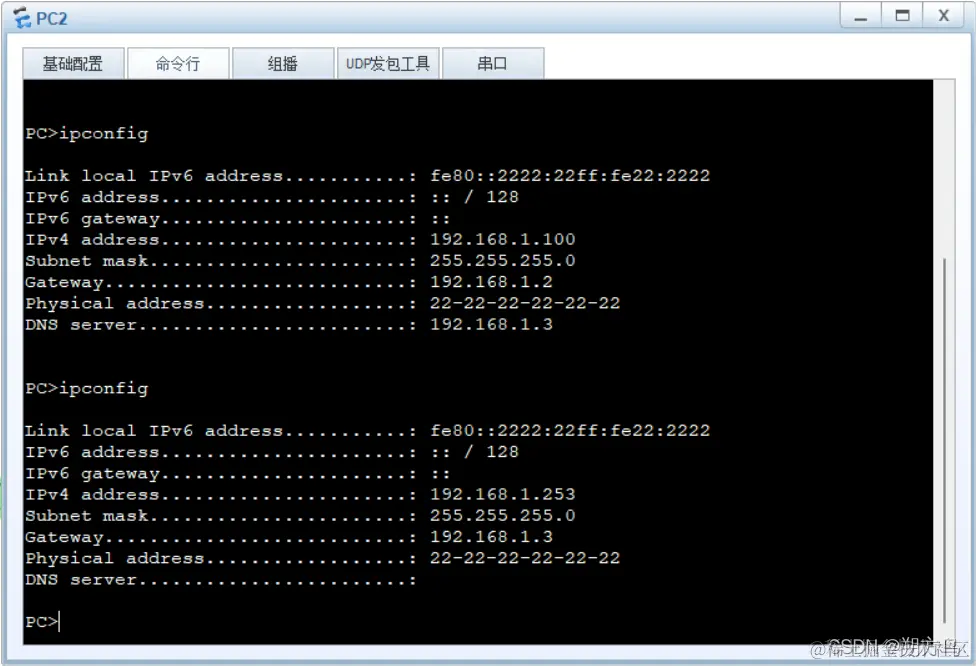 [DHCP SE-ip-pool-dhcp]static-bind ip-address 192.168.1.100 mac-address 2222-2222-2222 //这里因为提前将PC2的mac地址改为了2222-2222-2222,实际配置时输入PC2的MAC地址即可,注意格式