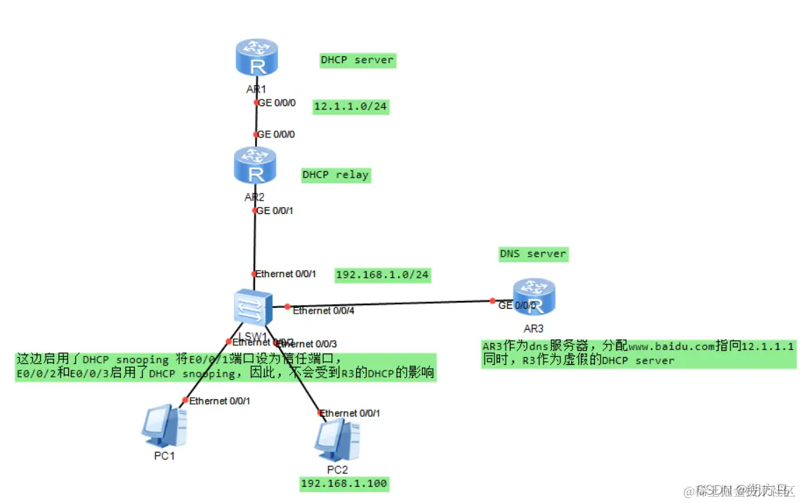 R1作为DHCP服务器,R2作为DHCP中继,R3作为DNS服务器,实现为PC1和PC2分配IP地址,其中,PC2的IP地址分配固定值192.168.1.100,DNS服务器解析要求可以将www.shuofangniao.com解析为12.1.1.1。