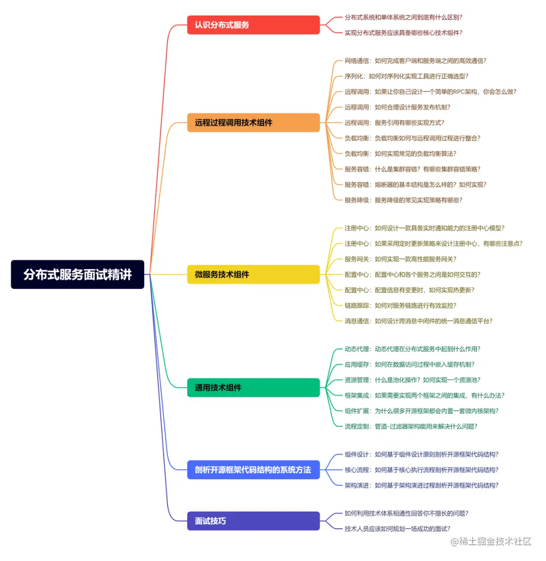 天涯兰(也是掘金小册 《DDD 案例实战课》 作者),10 余年工作经验,长期从事分布式系统的构建和优化工作,负责过大型电商以及健康类系统的设计和开发,曾带领团队完成大规模微服务架构的建设工作,对分布式服务相关的主流开源框架和技术体系有着丰富的实践经验。同时,我也在互联网独角兽和大型上市公司担任过架构师、技术总监等职务,因此也是一位资深的技术面试官,面试过的候选人不下数百名。 ·课程如何设计 · 作为一门基于面试分析来驱动的课程,我将基于如下所示的思维导图来组织课程的内容: