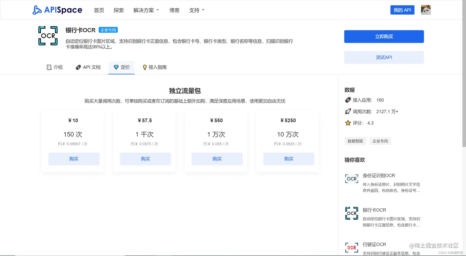API Space 上的API都支持免费试用,可以在定价这里看到免费试用次数以及价格套餐,点击免费套餐的购买按钮,就可以进行第二步做测试啦。