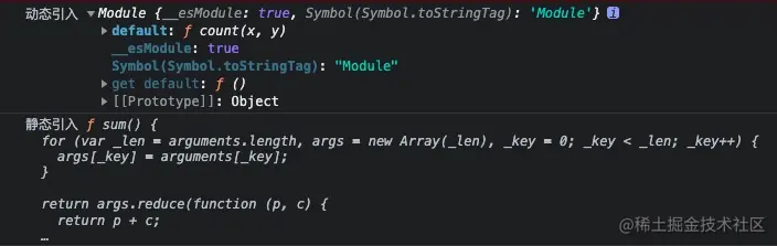 控制台打印正常引入和动态引入的两个方法,对比输出结果。使用动态引入的方法时,改为fn.default()。