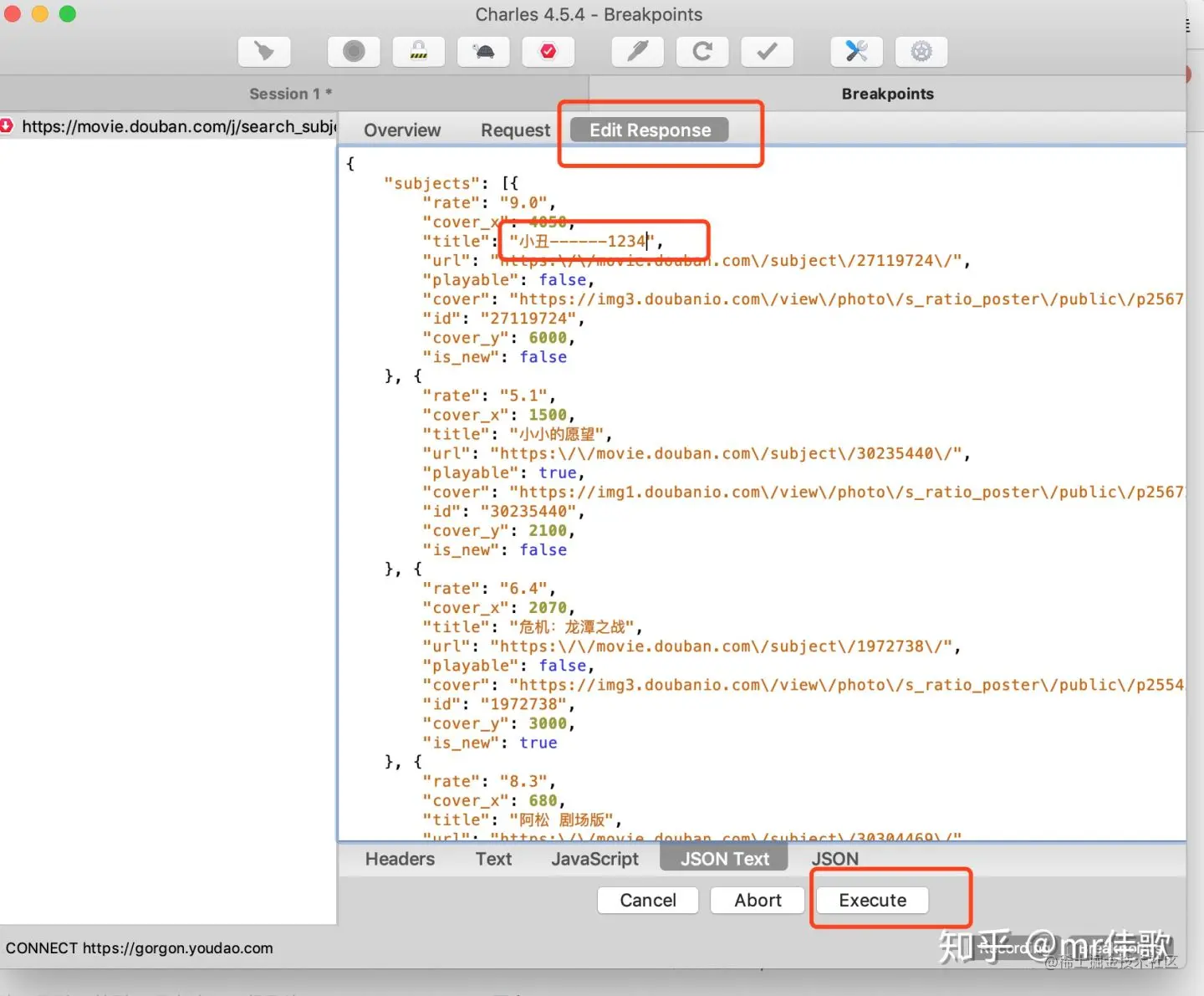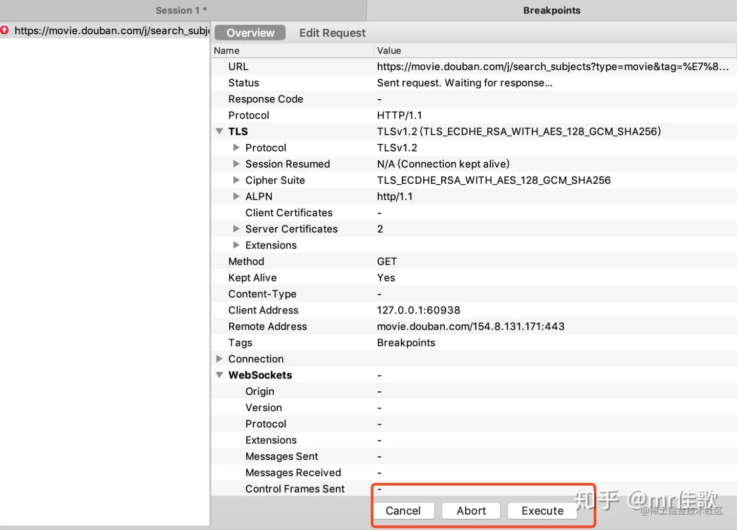3、再次请求该页面,该页面刷新后,热门电影区域显示空白,charles 首先弹出“请求”选择框,有 “Cancel”、“Abort”、“Execute” 三个选择,选择 “Execute”,让 charles 通过这次请求。