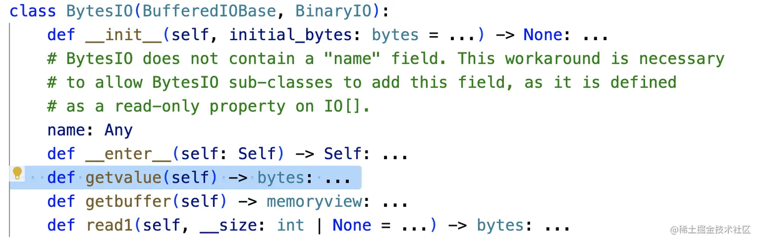 f.getvalue()通过查看python中的代码,如下图查看f源码库,可以看到,返回的是bytes类型,这里在Java侧则是返回的PyObject对象,然后通过toJava转换数据类型。