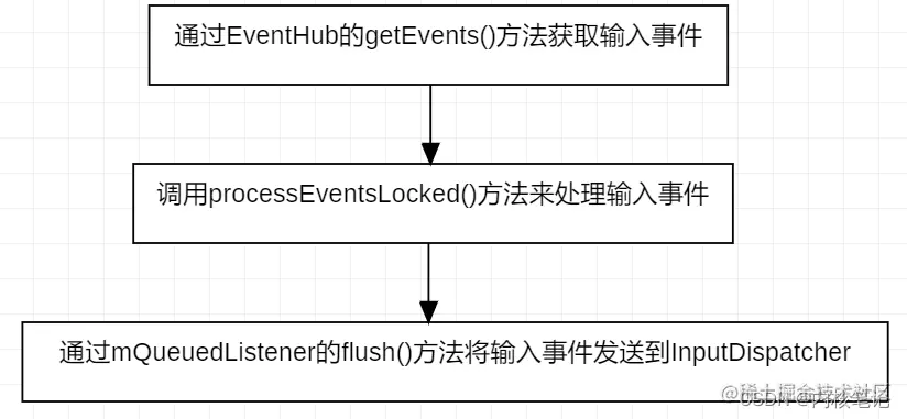 Android系统的输入事件是由InputManagerService服务来监控的,该系统服务在SystemServer的startOtherServices()中初始化。初始化的过程中会在Native层创建InputReaderThread和InputDispatcherThread两个线程,InputReaderThread的主要工作是读取输入事件,然后将输入事件传递给InputDispatcherThread,最后由InputDispatcher将输入事件分发到应用层。从源码的角度来看,InputReaderThread线程中,会循环执行threadLoop()方法,该方法又会调用InputReader的loopOnce()方法,而loopOnce()方法则主要做了三件事,可描述为图所示的流程: