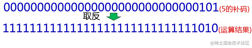 首先把数字5转换成补码形式,之后把每个二进制位上的数字进行取反,如果是0就变成1,如果1就变成0,经过取反后得到的二进制串就是运算结果,此时是补码的形式,需要转回原码,符号位为1,其余各位取反,然后再整个数加1, 这个运算结果被还原为十进制数是-6。