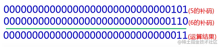 同样是先转成补码,然后异或计算,得到最后的二进制结果11,转成十进制为3。