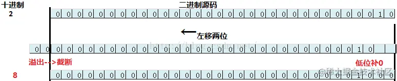 左移位运算符为<<,其运算规则是:按二进制形式把所有的数字向左移动对应的位数,高位移出(舍弃),低位的空位补零。
