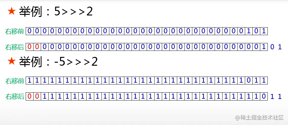 无符号右移运算符为>>>, 其运算规则是:无符号右移在二进制串移动之后,空位由0来补充,与符号位是0还是1毫无关系,注意这里的无符号是忽略符号位,也参与移位。