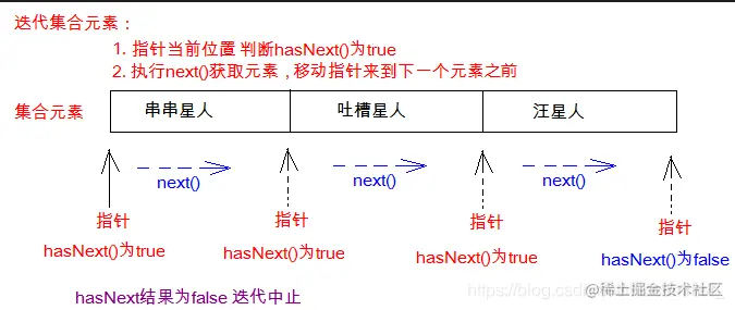 在调用Iterator的next方法之前,迭代器的索引位于第一个元素之前,不指向任何元素,当第一次调用迭代器的next方法后,迭代器的索引会向后移动一位,指向第一个元素并将该元素返回,当再次调用next方法时,迭代器的索引会指向第二个元素并将该元素返回,依此类推,直到hasNext方法返回false,表示到达了集合的末尾,终止对元素的遍历。