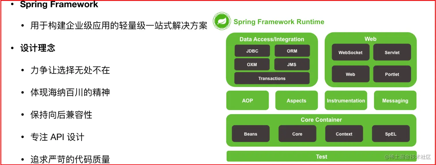 # Spring Framework:Spring框架,是Spring中最早最核心的技术,也是所有其他技术的基础。