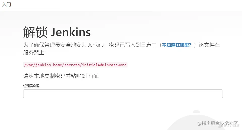 接下来我们就正式进入到Jenkins内部,我们需要登录才能进行下一步,那么在页面上Jenkins已经为我们说明了默认密码所在的位置,我们直接查看就能得到密码