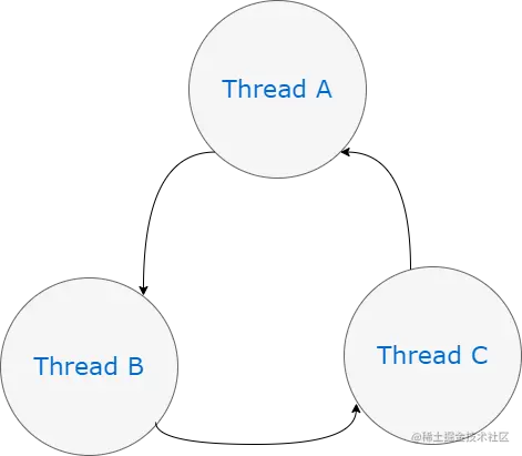 - 最后一个条件叫做循环等待。顾名思义,这个条件规定了一组进程(或线程)的存在,因此这组进程中的第一个进程(或线程)正在等待第二个进程(或线程)释放资源,而第二个进程(或线程)又需要等待第三个进程(或线程);最后,这组进程中的最后一个进程(或线程)正在等待第一个进程。
