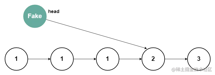 那么这个时候咱们就不用考虑头结点的事情了,因为 头结点是永远不会被删除的,咱们直接按照逻辑去找相同的节点,找到挨着的最后一个相同的节点后,便将 Fake 节点的 next 指针指向下一个不同值的节点即可,例如这样