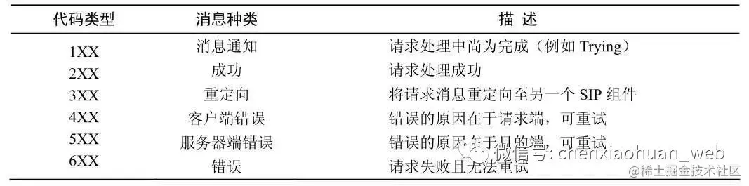 SIP有两种类型的消息:①请求,从客户机发送到服务器的消息;②响应,从服务器发送到客户机的消息。响应消息包含数字响应代码,SIP响应代码集部分基于HTTP响应代码,有两种类型的响应:①临时响应(1XX),临时响应被服务器用来指示进程,但是并不终结SIP会话;②最终响应(2XX、3XX、4XX、5XX、6XX),最终响应终止SIP会话。