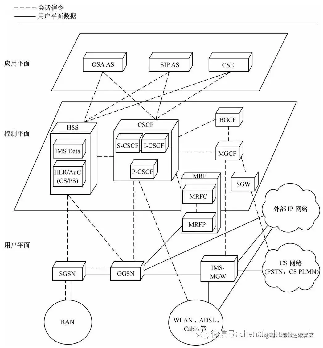 IMS技术对控制层功能做了进一步分解,实现了会话控制实体(Call Session Control Function,CSCF)和承载控制实体(Media Gateway Control Function,MGCF)在功能上的分离,使网络架构更为开放、灵活。