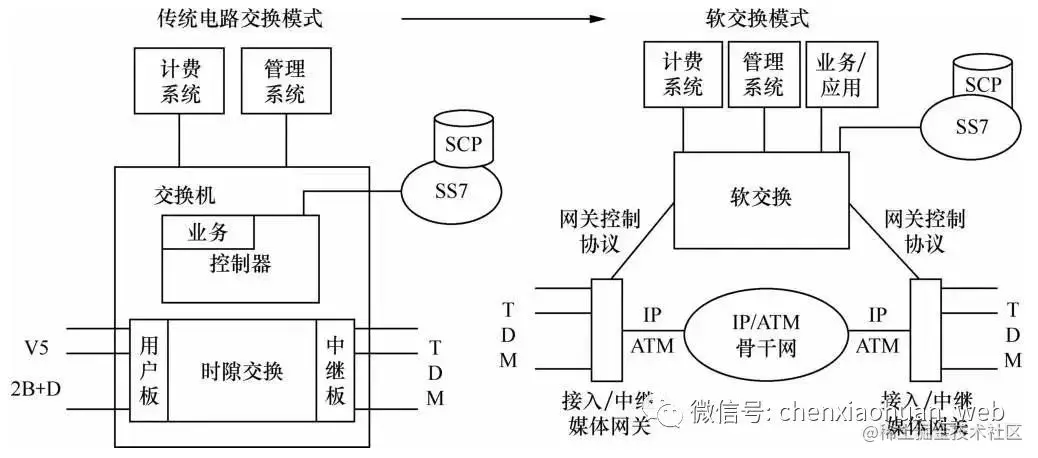 传统交换机的功能被软交换和接入/中继/媒体网关所代替,网关把TDM(Time Division Multiplexing,时分复用)流转换为RTP(Real-time Transport Protocol,实时传输协议)流在IP网上传送。