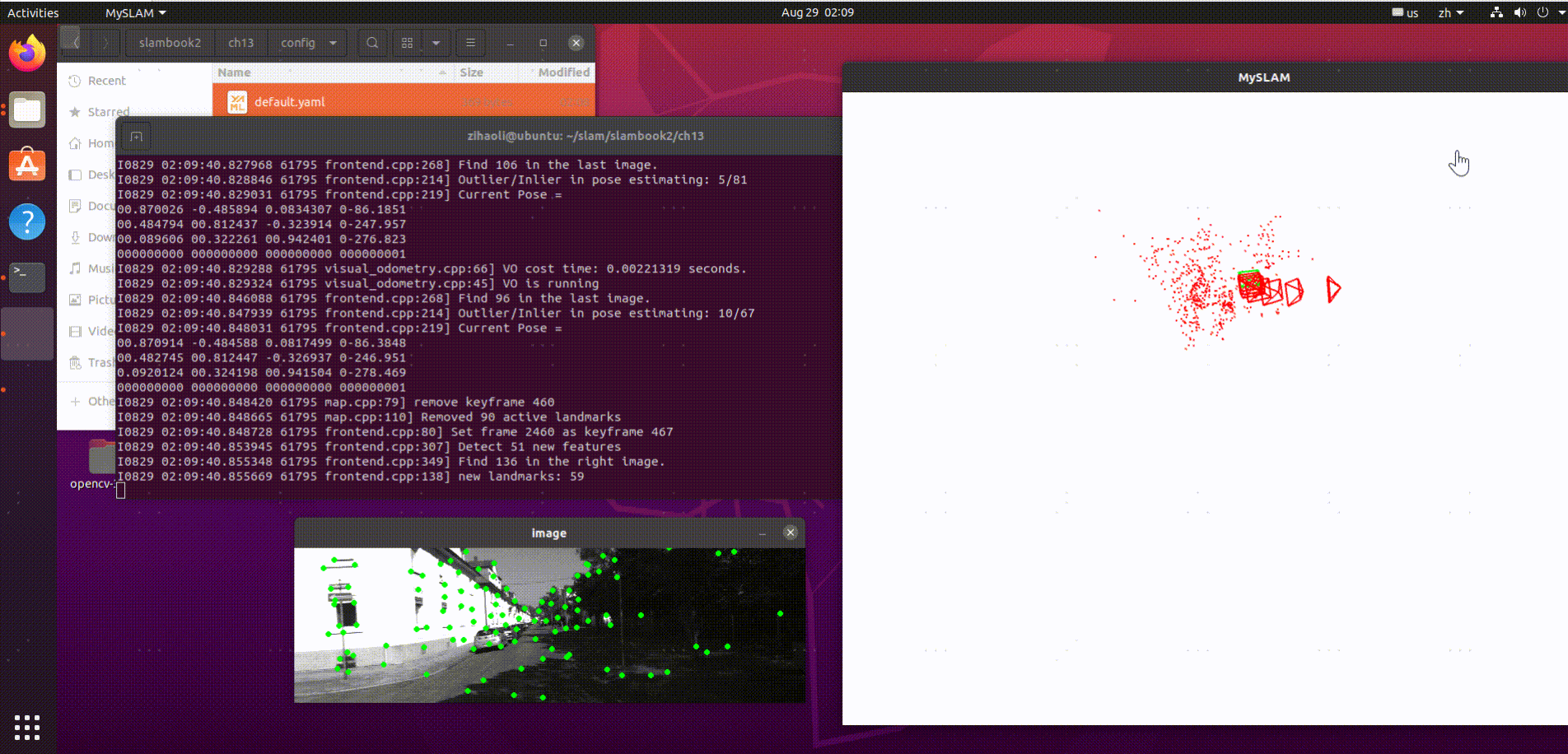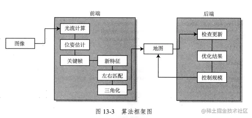 - 前端:提取图像特征值,与上一帧进行光流追踪,通过光流结果计算该帧的定位,并在必要时补充新特征点且三角化;