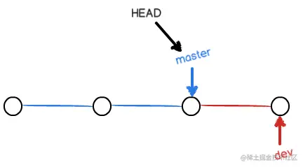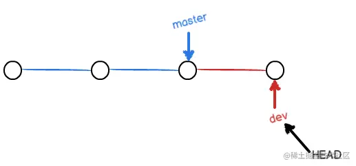 ④ 在 dev 分支上, 进行一次新提交后, dev 指针向前移动一步, 而 master 指针不变: