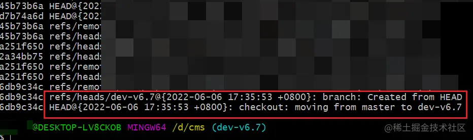 结果如下,最后的一条 checkout: moving from xxx to xxx,表示当前分支的 base 分支。