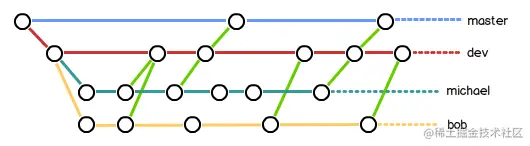 每个人都在 dev 分支上干活, 每个人都有自己的分支, 时不时地往 dev 分支上合并就可以了. 所以, 团队合作的分支看起来就像这样: