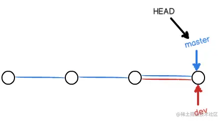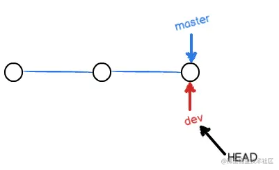 Git 会创建一个指针叫 dev ( 指针名和分支名相同 ), 指向 master 所指向的位置, 再把 HEAD 指向 dev, 就表示当前分支在 dev 分支上.