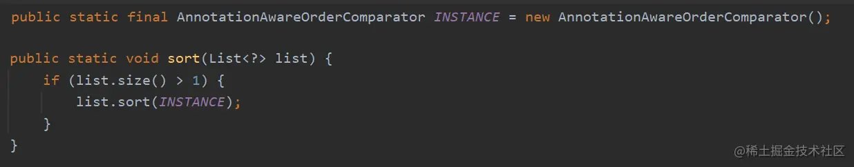 list.sort() 方法中传入了排序规则INSTANCE,而 INSTANCE 是 AnnotationAwareOrderComparator 类的实例,AnnotationAwareOrderComparator 类继承自 OrderComparator 类,而 OrderComparator 实现了 Comparator 接口。