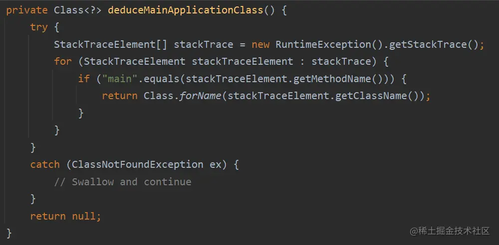 可以看到,方法内部是 new 了一个运行时异常 RuntimeException,然后获取其异常堆栈信息 stackTrace,遍历堆栈,找到有 main 方法的类,把该类作为启动类。后续扫描包的范围就确定了下来。