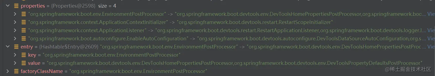 Properties properties = PropertiesLoaderUtils.loadProperties(resource)则是把文件的内容转为了 Properties 对象。 spring.factories 文件是 key=value 类型的。