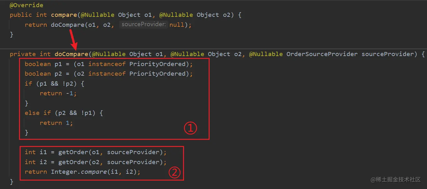 我们知道比较的核心方法是compare() 方法,而 AnnotationAwareOrderComparator 并没有重写该方法,我们直接去父类 OrderComparator 中查看,源码如下: