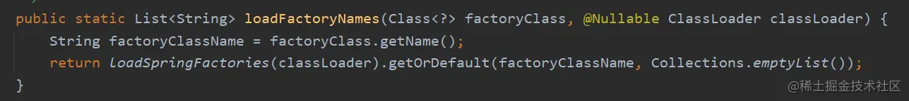 进入SpringFactoriesLoader.loadFactoryNames()方法,源码如下: