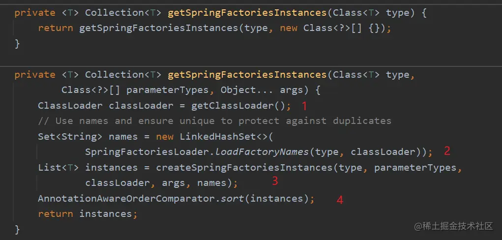 首先getSpringFactoriesInstances(ApplicationContextInitializer.class)方法源码如下: