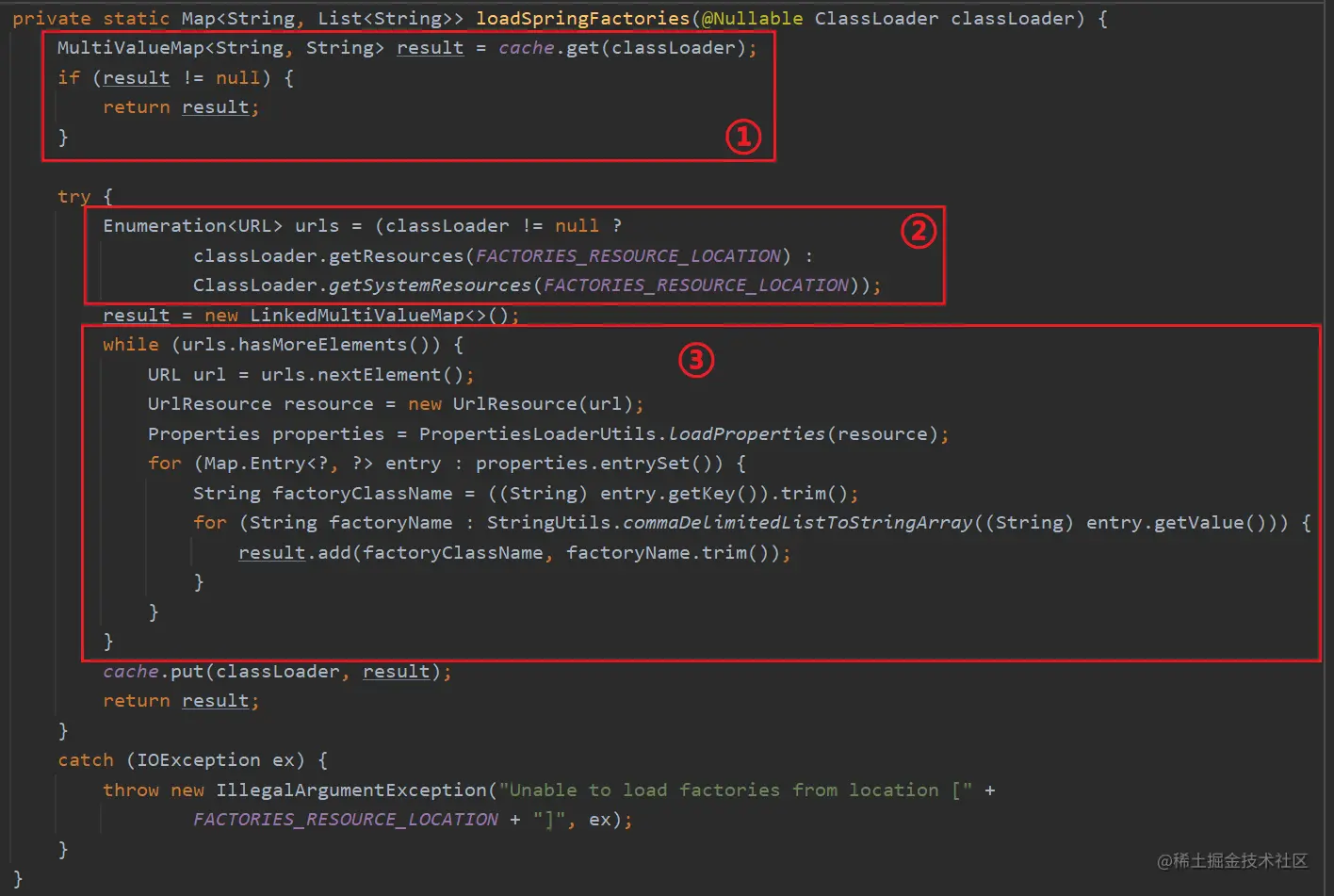 ① 从缓存 cache 中获取,存在则直接返回。因为这个方法后面用到的次数特别多,所以这里添加了缓存。不过启动流程这里是整个 SpringBoot 中该方法的首次调用,所以 cache 为空,会走后面的逻辑。