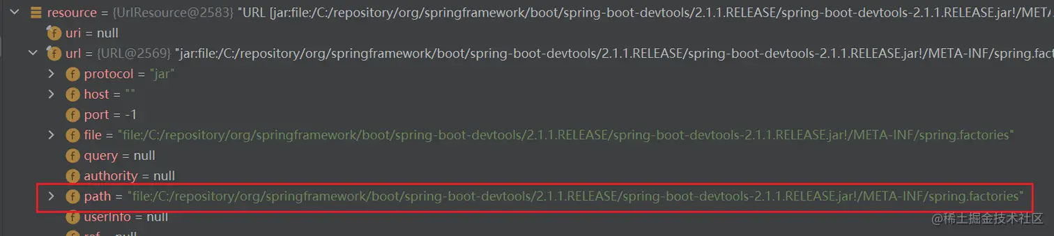 UrlResource类是 Spring 提供的,用来访问文件的类,UrlResource resource = new UrlResource(url)就是读取到指定的 spring.factories 文件。