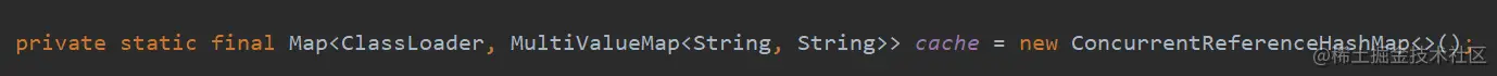 可以看到 cache 是一个 ConcurrentReferenceHashMap 类,key 是 ClassLoader,value 是一个Map<String,List>,value 的 key 是 factoryTypeName,value 的 value 是factoryImplementationNames。