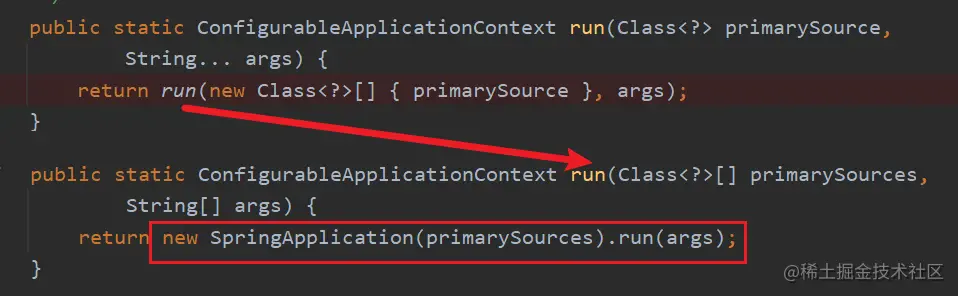 可以看到,启动类 main 方法中,调用了 org.springframework.boot.SpringApplication 的静态 run 方法。