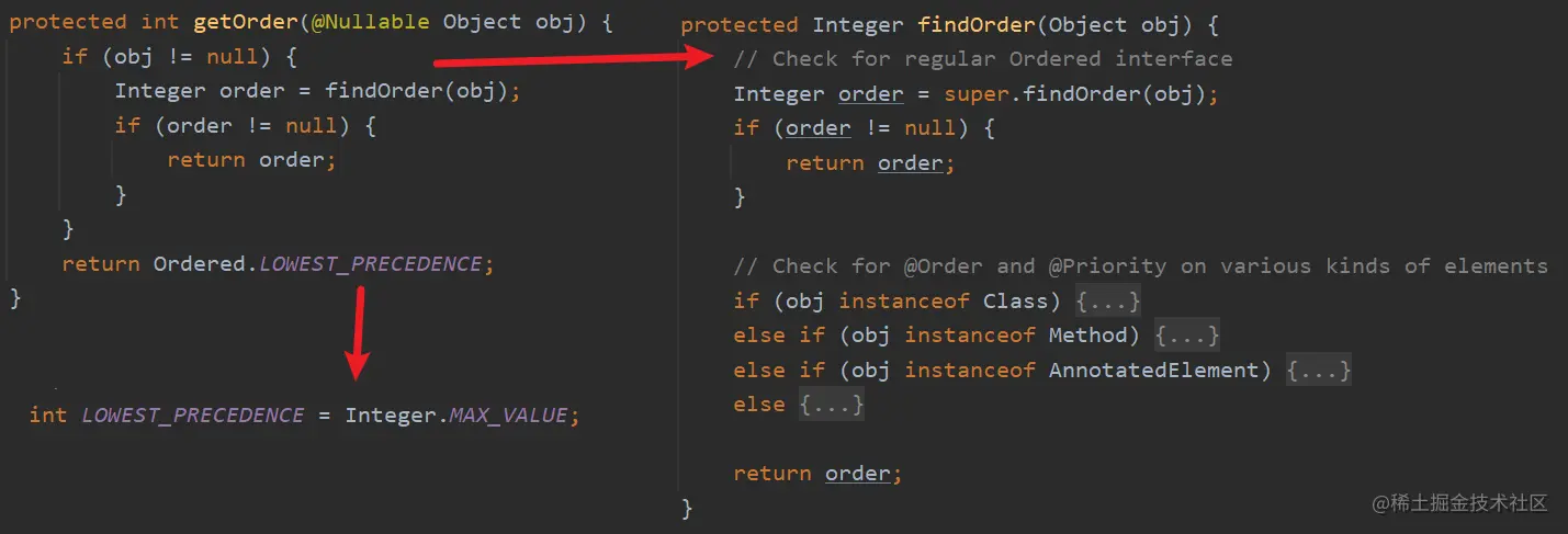 该方法内部则分别进行判断是否是 Ordered 接口的实现类,是否有 @Order 注解,是否有 @Priority 注解,如果这些都没有,则返回Ordered.LOWEST_PRECEDENCE。