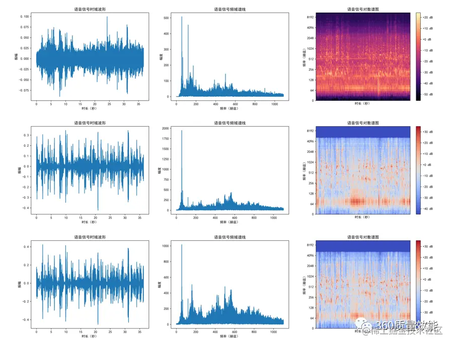 下图展示了一段在复杂环境中录制的音频信号和经过降噪后该音频的时域波形与频谱图,其中,第一行为原始音频的时域和频域表现,第二行和第三行分别为基于U-Net和LSTM作为基础网络的降噪模型降噪后的音频的时域与频域表现。