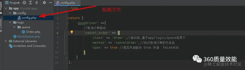 app/config/config.php配置文件,quueDriver为存储的每个队列驱动,cancel_order为取消订单驱动,cancel_order下class值对应app/logic/ Order.php, app/WorkQueue.php->consume()会自动去根据配置到app/logic/下加载这个类;配置method为class对应的类中执行业务逻辑的方法;open代表是否开启此队列,true开启 false关闭,如果为false即使定时任务请求进来,也会中止程序不执行业务代码。