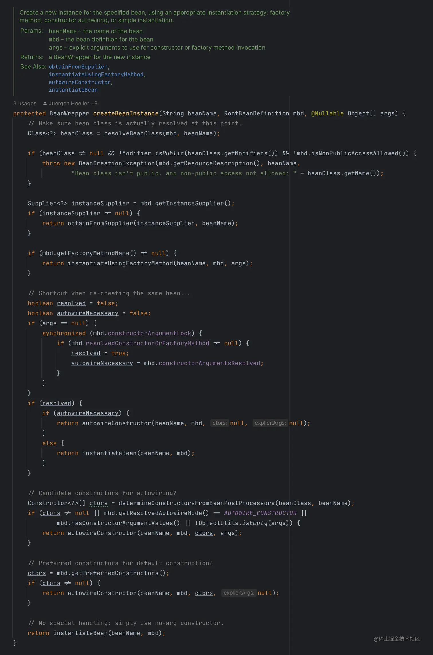 方法中代码比较多,因此才用了截图的方式。Spring 通过默认方式创建 Bean 实例的过程就都在这个方法里了。我们从上到下逐步分析。