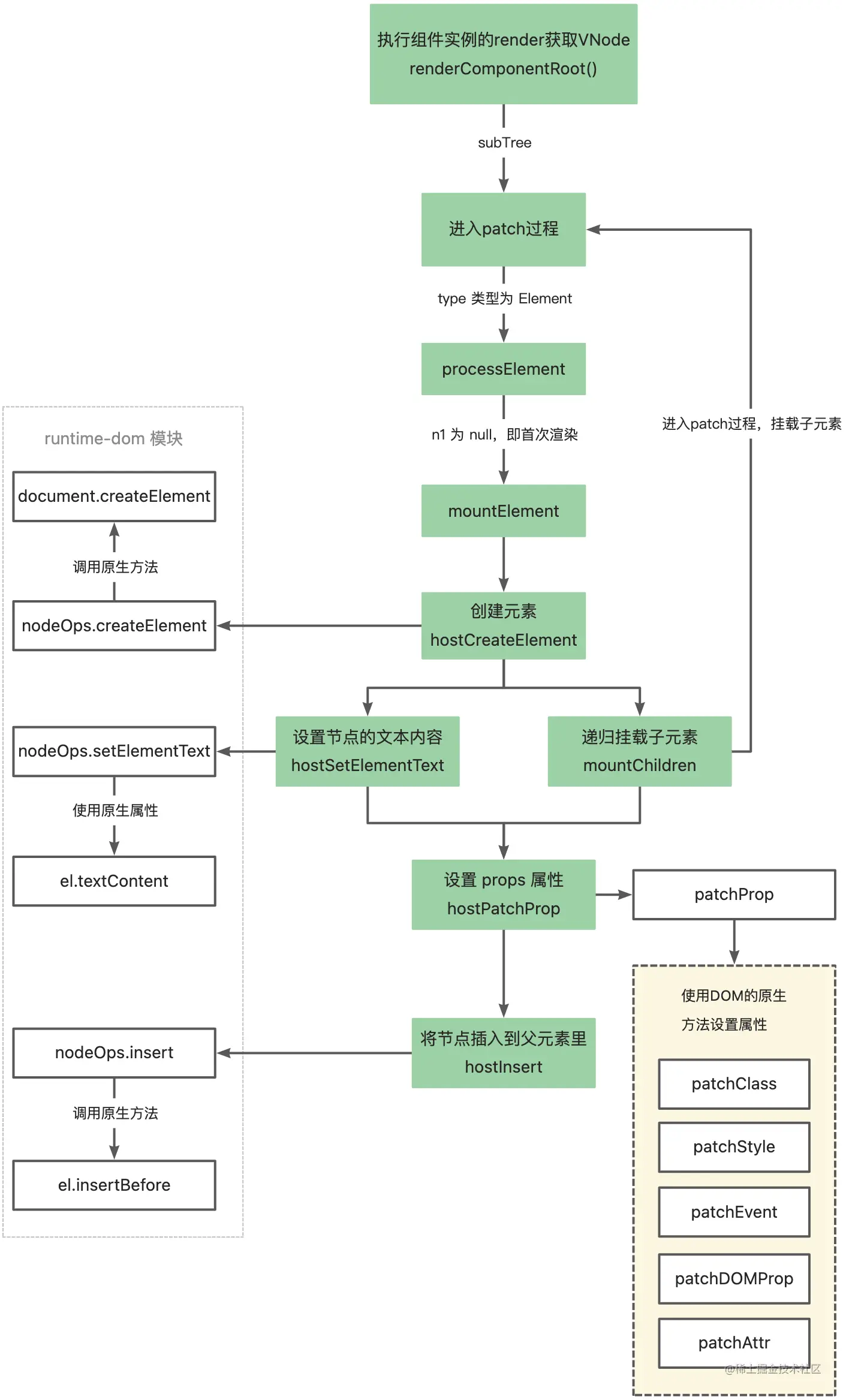 在首次渲染过程中,完成了根组件实例的挂载后,Vue3会将template的内容编译后存放在根组件实例的 render属性上(具体实现可参阅vue3源码解读之初始化流程中的finishComponentSetup)。然后在开始渲染根组件时执行当前根组件实例的render函数获取子元素的VNode,将子元素的VNode传入patch函数中,递归渲染子元素(具体实现可参阅vue3源码解读之初始化流程中的setupRenderEffect)。