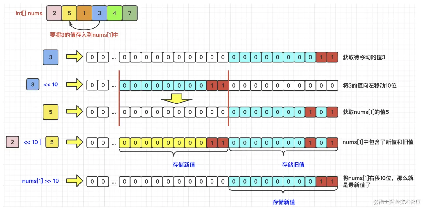 有没有更好的思路呢,能否让空间复杂度是O(1),不需要利用额外的数组。这里我们关注到题目的一个细节1 <= nums[i] <= 10^3, 也就是说nums数组的值最大是1000,换算二进制的话,也就是占用10位,而int的话在java中占用32位。我们能否用高位存储低位的内容? 显然是可以的。