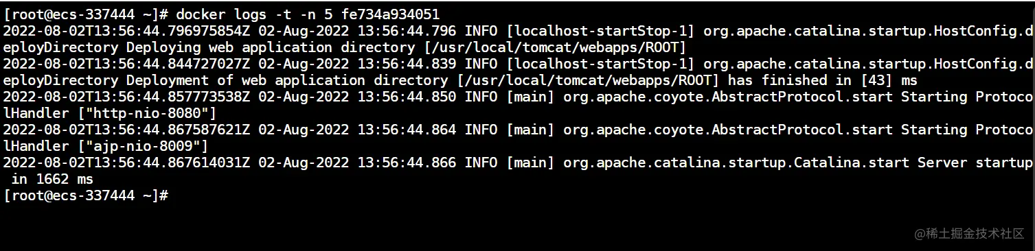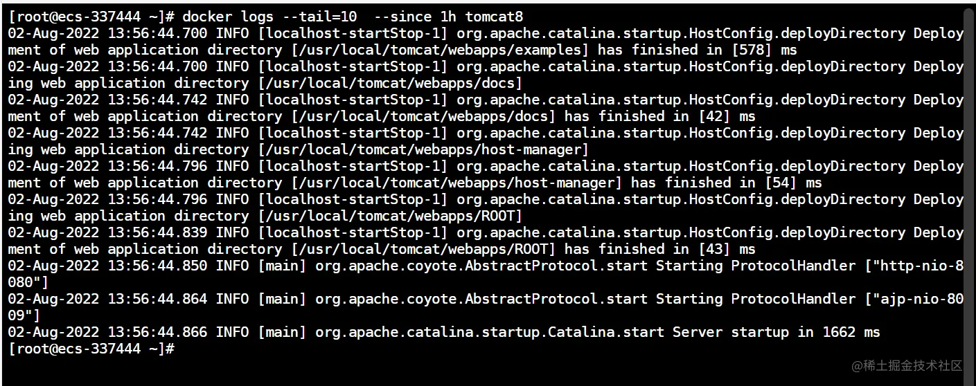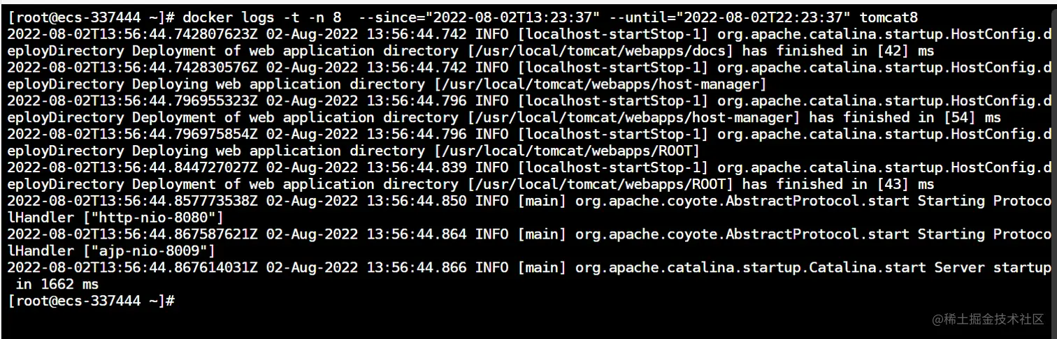 docker logs -t -n 8 --since="2022-08-02T13:23:37" --until="2022-08-02T22:23:37" tomcat8