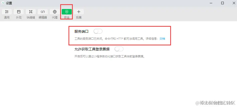 [微信小程序开发者工具] × #initialize 鲤鱼_599 2022-08-30 757 阅读1分钟 uni-app无法启动微信开发者工具,报错,需要打开服务端口 [微信小程序开发者工具] × #initialize-error: [error] 工具的服务端口已关闭。要使用命令行调用工具,请在下方输入 y 以确认开启,或手动打开工具 -> 设置 -> 安全设置,将服务端口开启。 从HBuilder运行到微信小程序的时候报错 解决办法: 打开微信开发者工具,选择设置–>通用设置 点击安全,打开服务端口 重新运行项目即可