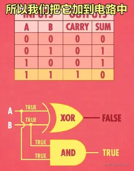 1+1的结果是0,1进到下一位。可以看到XOR的逻辑门并不支持这个(输入都为true输出为false只对了一部分)还需要一个输出线用于表示进位,所以我们需要稍加修改